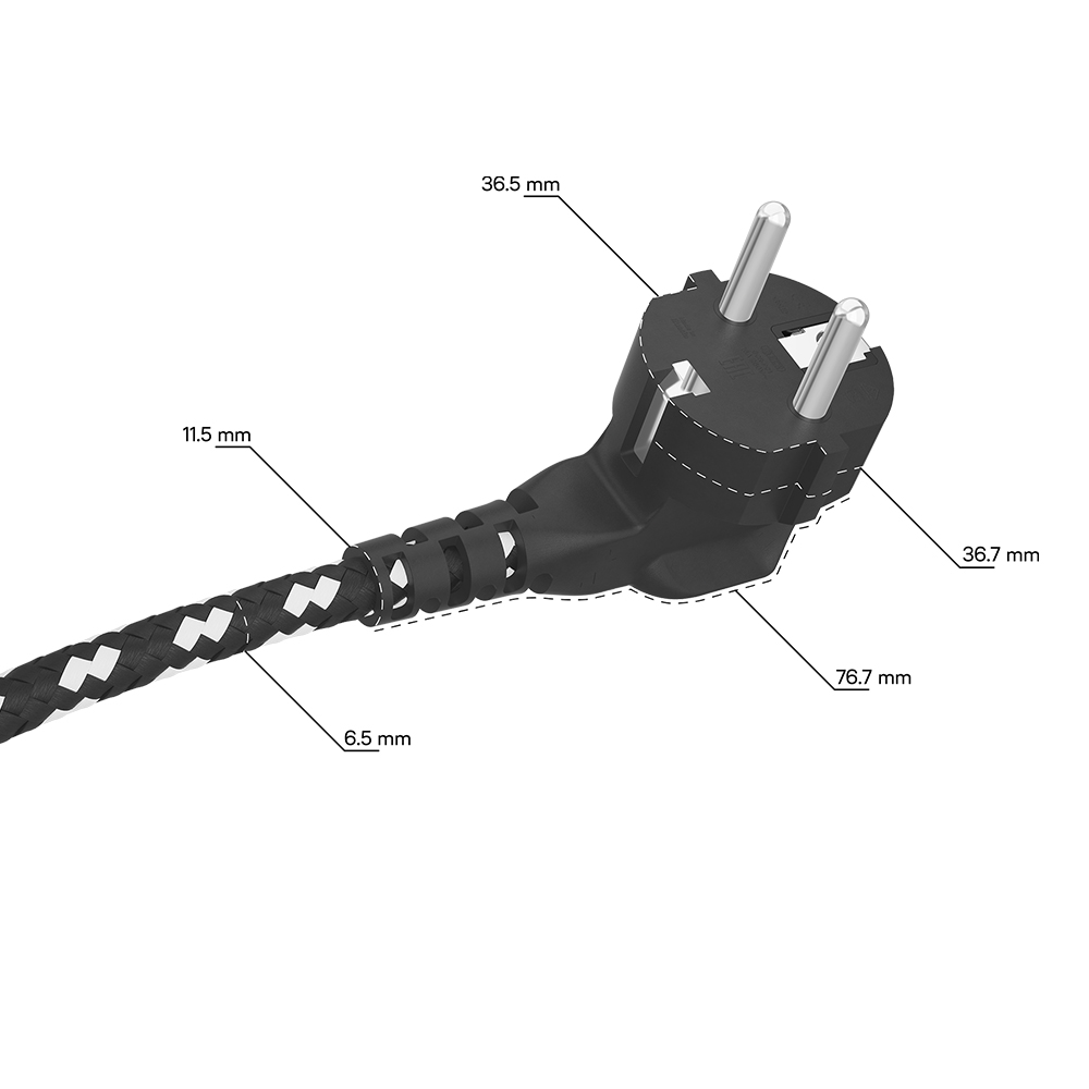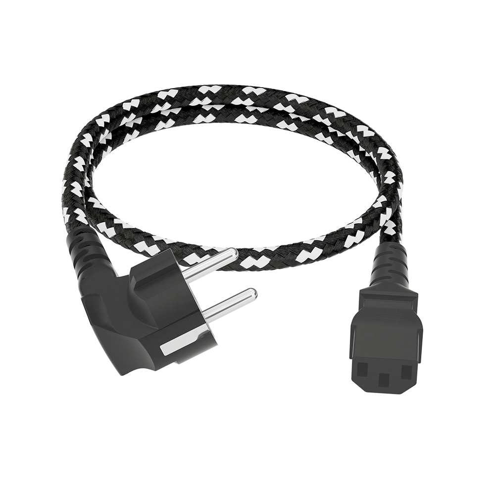 The power cable is made of high-quality materials and consists of a three-core wire with a copper conductor cross-sectional area of 0.75mm². On one end, it features a molded, non-detachable angled Europlug with a grounding contact, and on the other end, a molded three-pin C13 connector.
