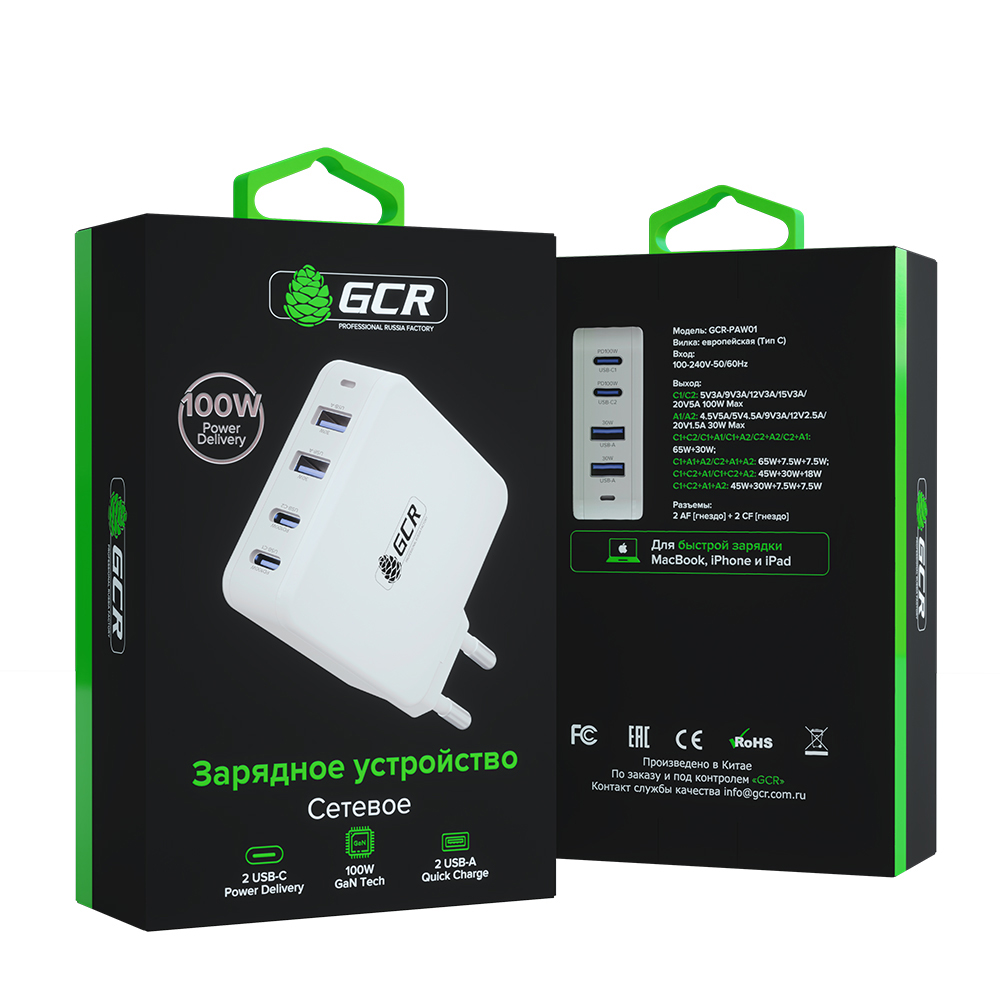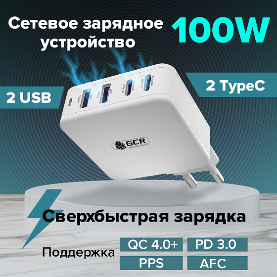 GCR PRO Сетевое зарядное устройство 100W GaN 2xUSB+2хUSB-C QC/PD