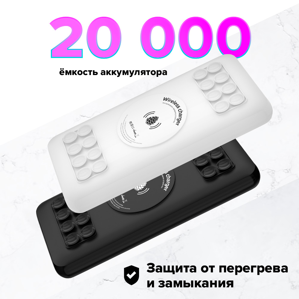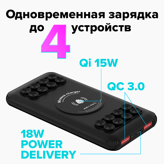 С помощью присосок, расположенных на одной стороне корпуса, повербанк легко фиксируется на задней панели смартфона или планшета, благодаря чему можно заряжать гаджет без проводов прямо на ходу.