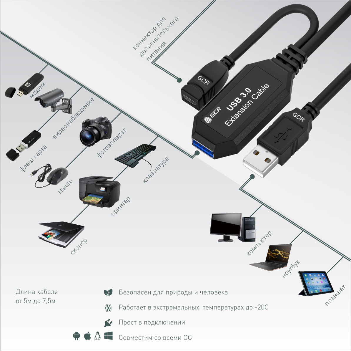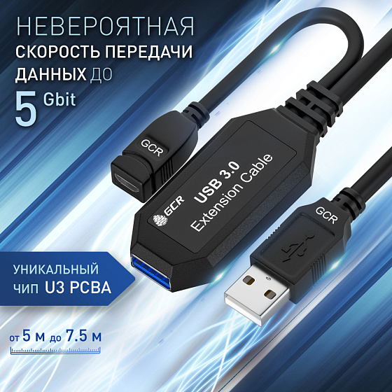Высокоскоростной активный удлинитель USB 3.0 необходим для подключения современных 4G и 5G модемов, скоростных внешних накопителей HDD и SSD, а при наличии хаба или разветвителя с его помощью можно подключить нескольких скоростных флешек, web-камеру, мышь и клавиатуру на скорости до 5 Гбит/c, на расстоянии до 20 метров.