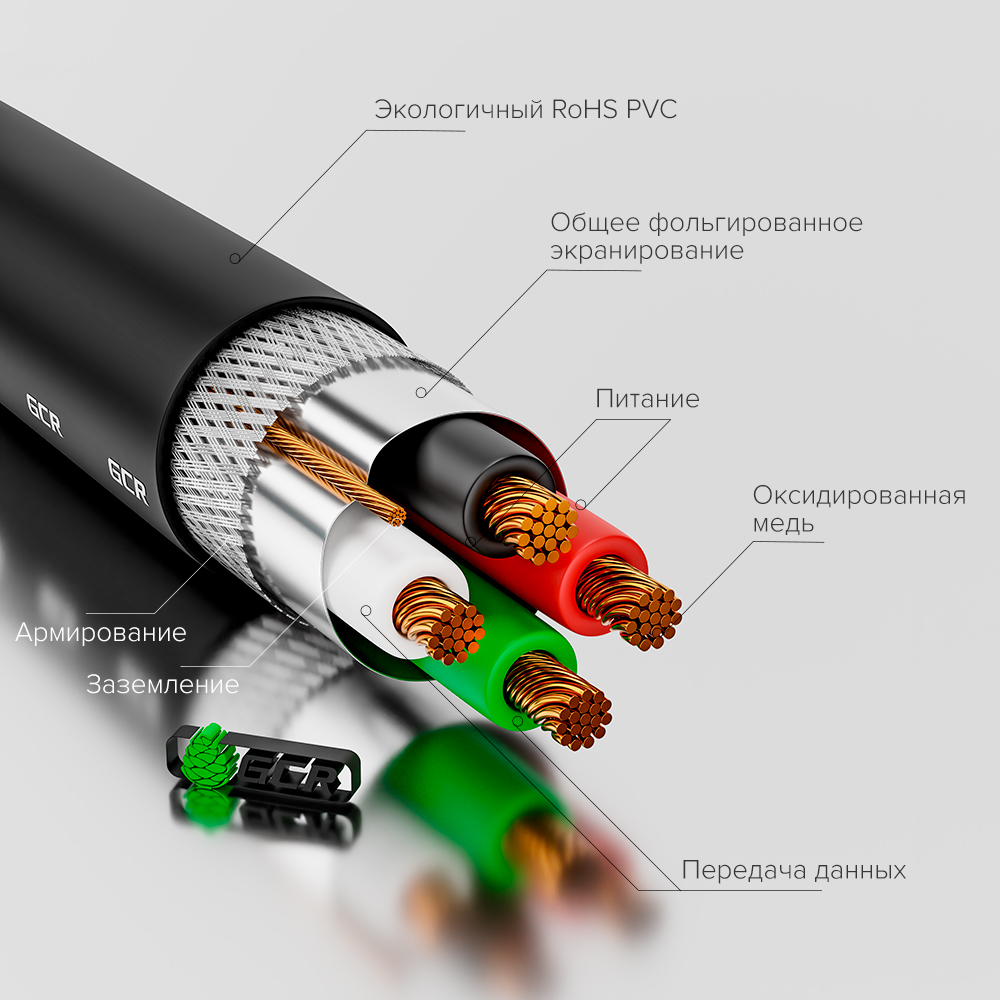 Двойное экранирование гарантированно защищает сигнал от электромагнитных помех и искажений, а проводник от внешних повреждений.