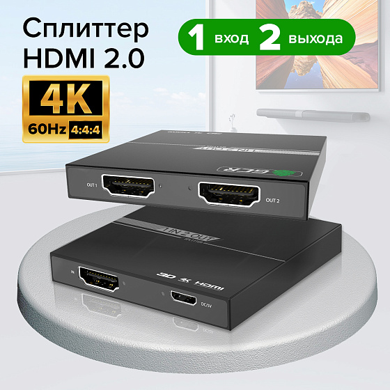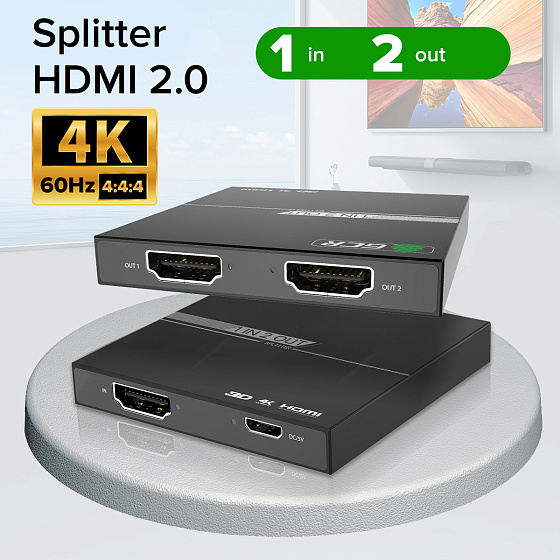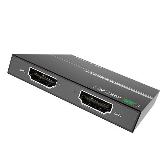 The HDMI splitter is designed to split one HDMI signal source into two HDMI outputs. It can be used to reproduce high-quality images on a demonstration stand or in a hardware store, broadcast sports events or entertainment shows in a bar or club, show educational and scientific programs in educational institutions, displaying the image on several screens simultaneously.