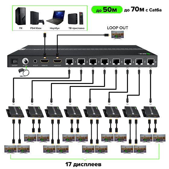 Сплиттер-удлинитель HDMI с одного источника на 17 дисплеев одновременно