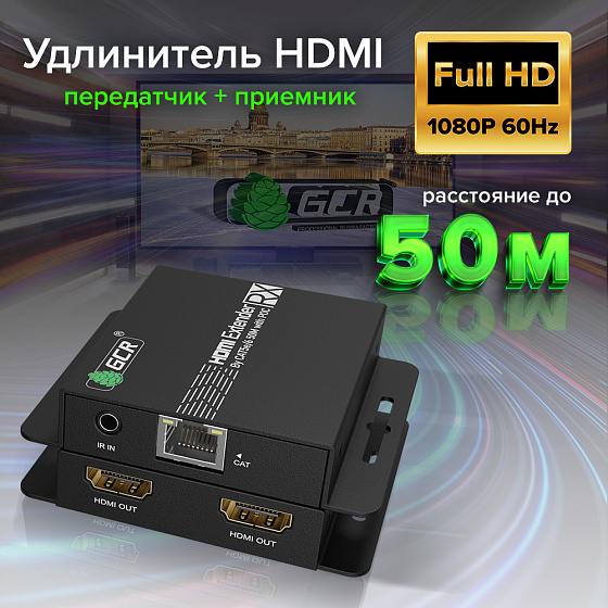 GCR PRO Удлинитель HDMI по витой паре до 50м 1080P передатчик + приемник ИК-управление 2 выхода HDMI + петлевой